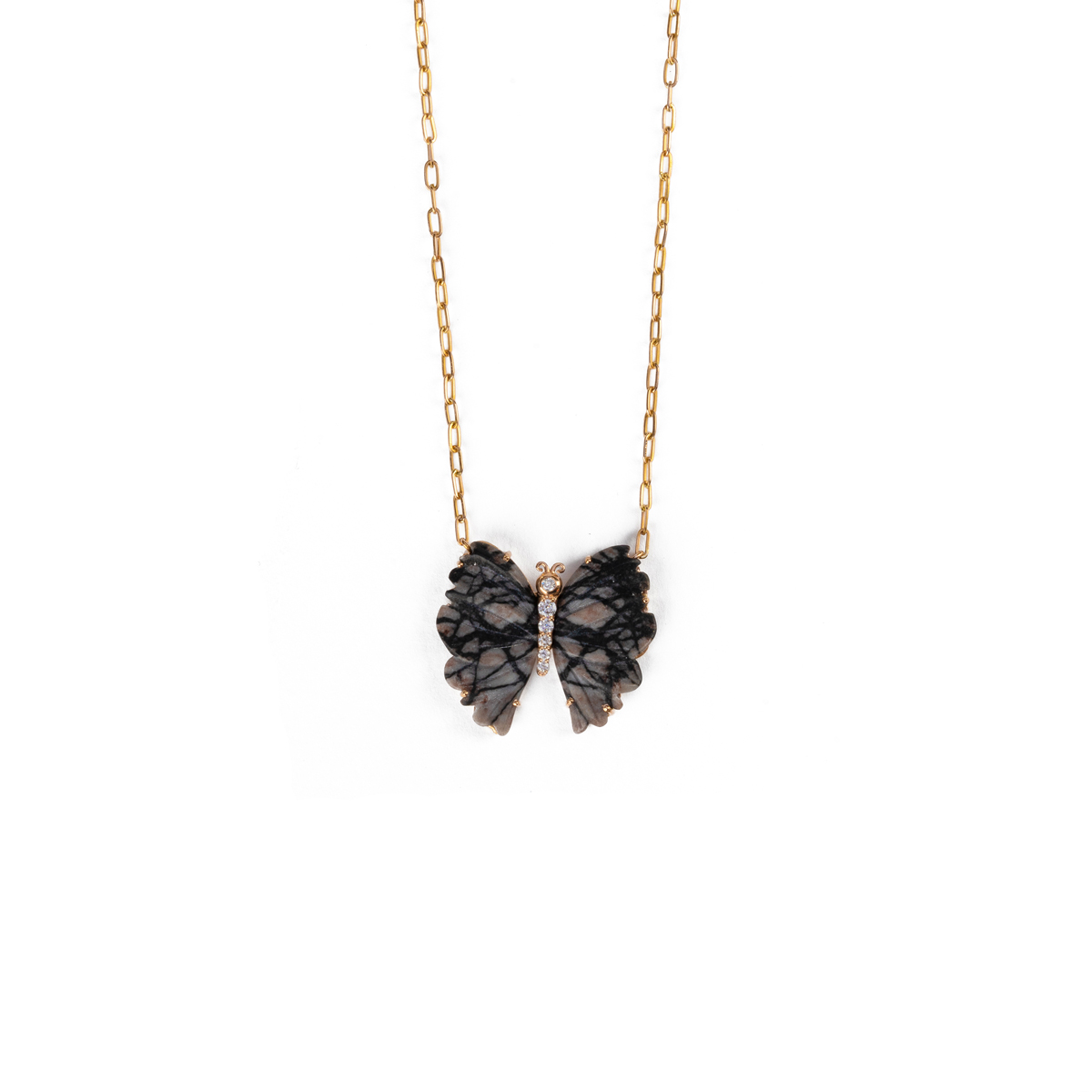 This stunning Agate Butterfly Pendant is delicately crafted on a handmade chain. The pendant features a total weight of 5.34 grams in 18K gold, with 0.09 carats of diamonds set in 6 stones. The agate stones weigh 5.21 grams and are beautifully arranged in 2 stones, adding a touch of elegance and natural beauty to this exquisite piece.