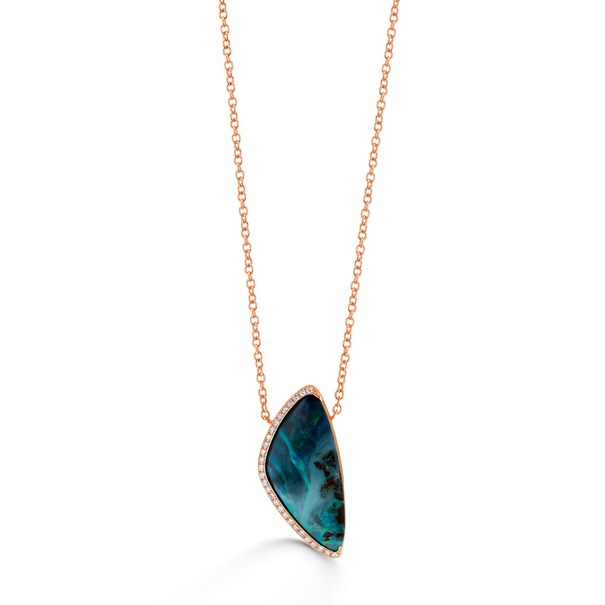 A vibrant boulder opal takes center stage, its natural iridescence framed by a half rim of shimmering Diamonds that highlight its one-of-a-kind beauty. Earthy yet luxurious, this pendant is a celebration of color, light, and individuality.