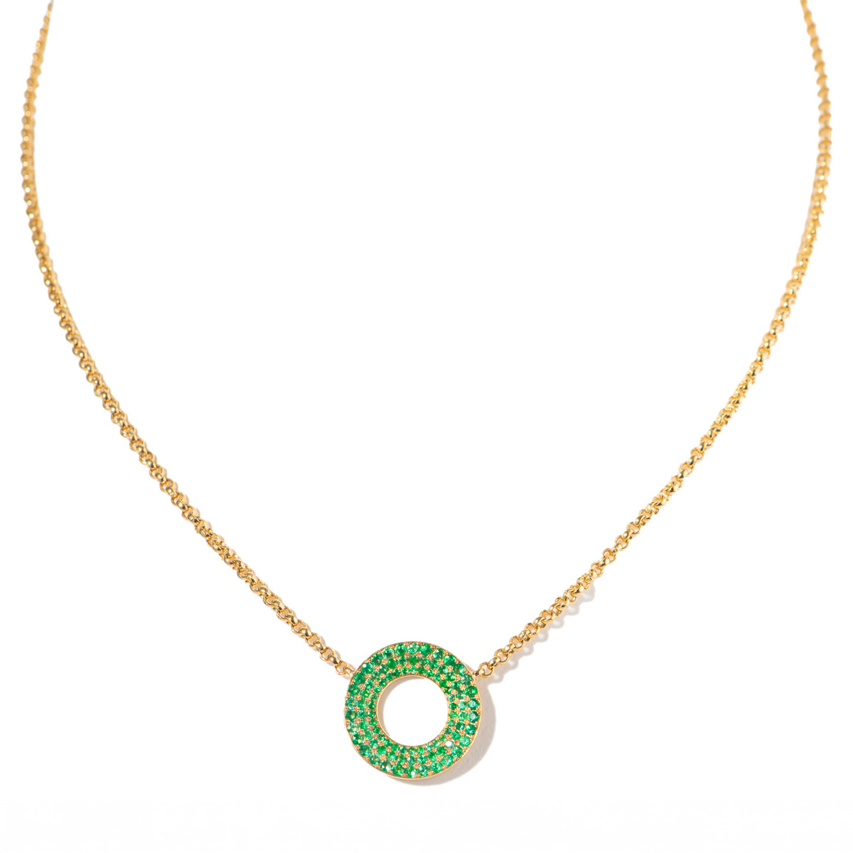 Our medium open round emerald pave pendant is a captivating piece adorned with the enchanting beauty of emeralds, totaling 0.57 carats. This pendant is a stunning representation of sophistication and timeless charm.