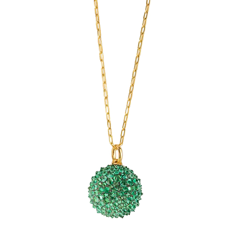A striking fusion of innovation and style, this bold pendant features 4.51 carats of emeralds set upside down in 227 stones, delivering a dynamic sparkle from every angle. Crafted in 9.63 grams of 18k gold, its spherical form and vivid green hues lend a playful yet refined edge to any look.