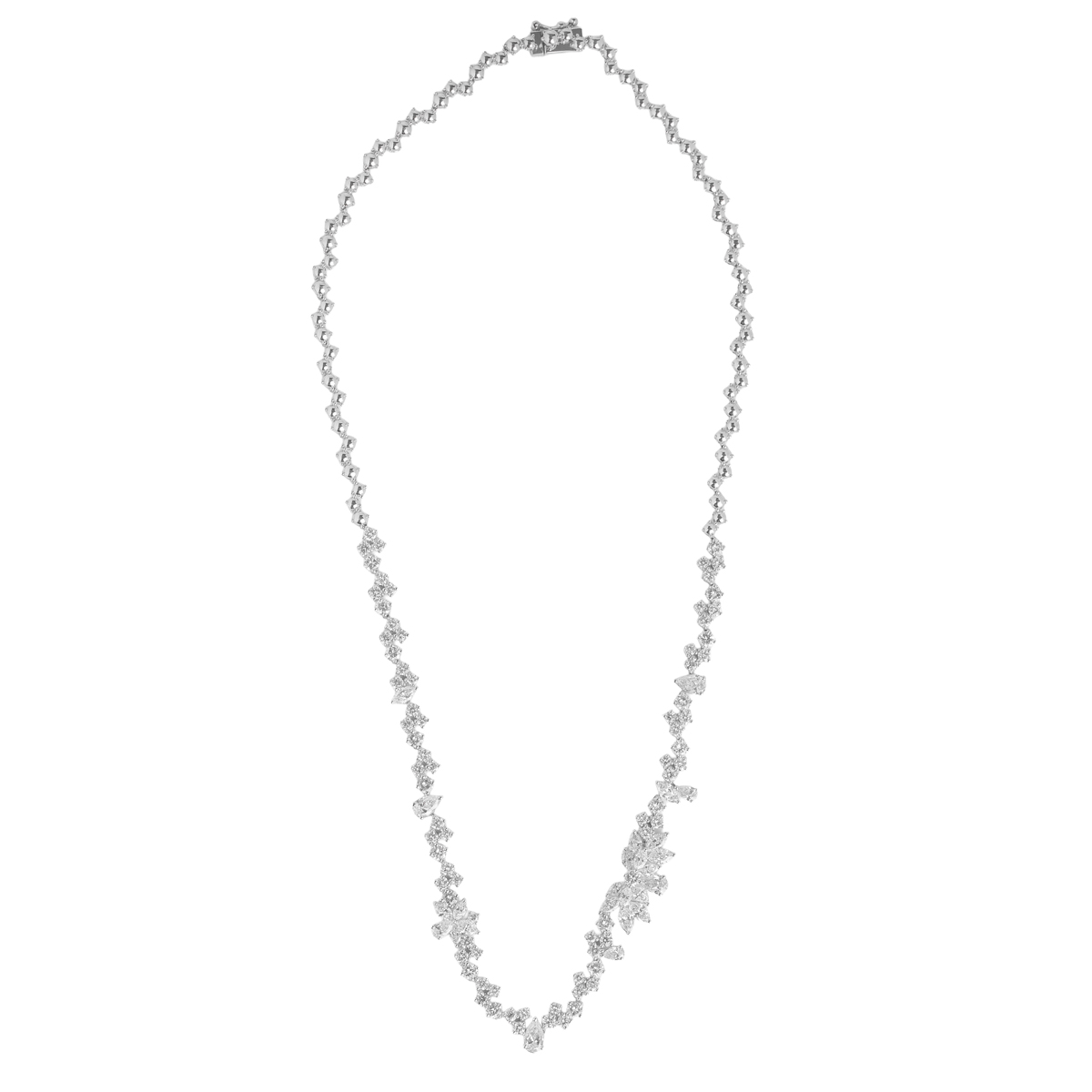 This extravagant necklace dazzles with a stunning arrangement of Marquise and pear-shaped Diamonds, totaling an impressive 9.5 carats. The expertly crafted design highlights each Diamonds brilliance, creating a luxurious statement piece that exudes elegance and sophistication and is guaranteed to catch all eyes.