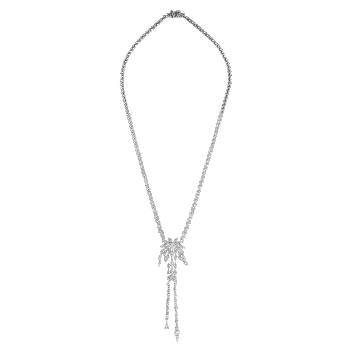 This elegant necklace features a graceful arrangement of Marquise and pear-shaped Diamonds, accented by delicate Diamond dangles that add movement and sparkle. The design beautifully balances sophistication and charm, making it a perfect statement piece for any occasion.