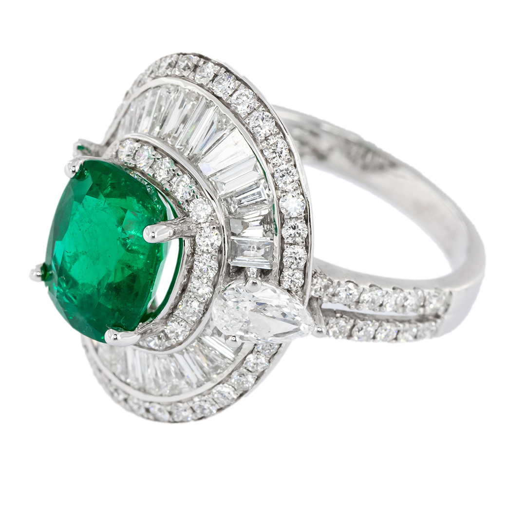 Introducing our breathtaking cushion emerald ring, a true embodiment of sophistication and natural beauty. This exquisite ring features a captivating cushion-cut emerald center stone weighing 6.23 carats, surrounded by an array of baguette and round diamonds totaling 2.5 carats.