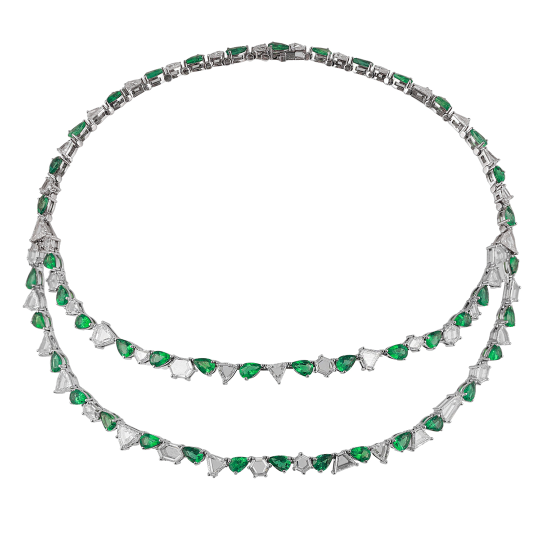 Portrait cut diamond and emerald necklace, a mesmerizing blend of elegance and luxury. This exquisite necklace features stunning portrait-cut diamonds, the pinnacle of precision and craftsmanship, alternating with vibrant emeralds that weigh an impressive 15.77 carats. The portrait cut diamonds, with their unique elongated shape and carefully carved facets, weigh a total of 13.86 carats and radiate brilliance and sophistication.